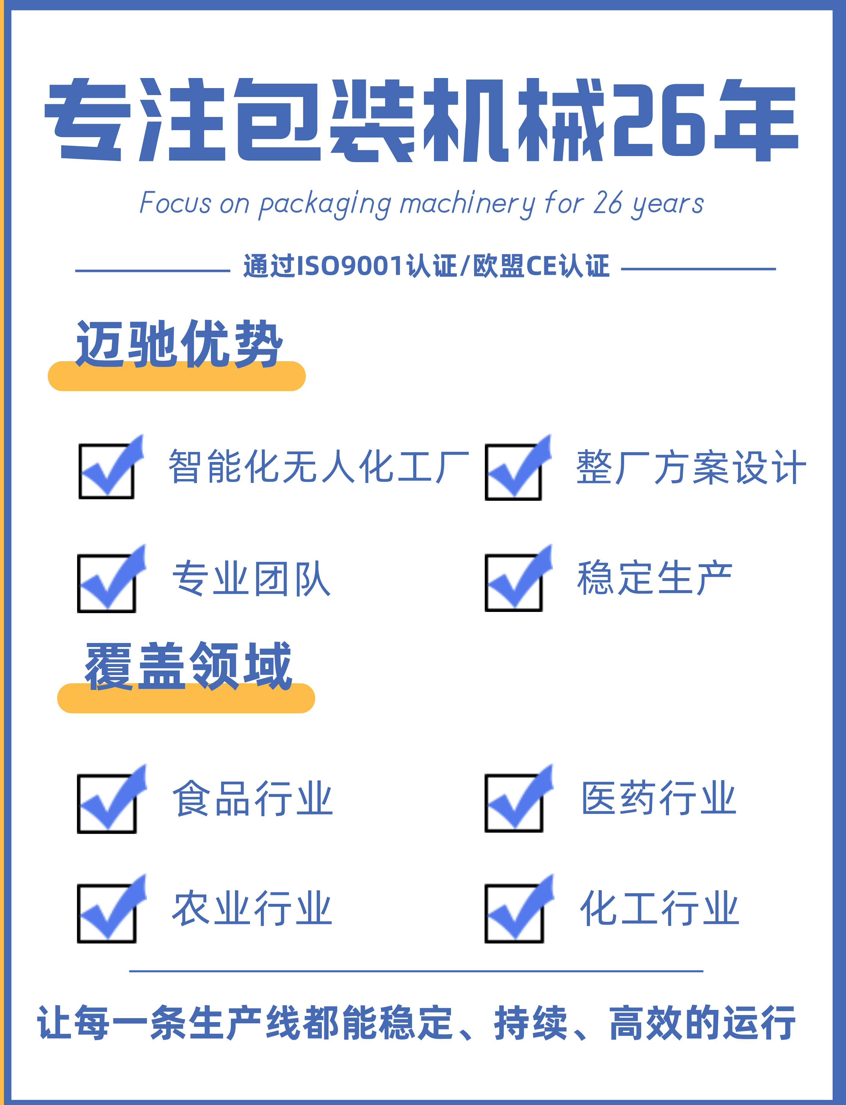 邁馳是一家專業生產全自動多列粉劑、粉末包裝機整線廠家,可根據客戶不同物料特性定制一對一方案,可根據產量定制列數-有序理料裝盒-自動裝箱-機器人碼垛。整廠方案設計...